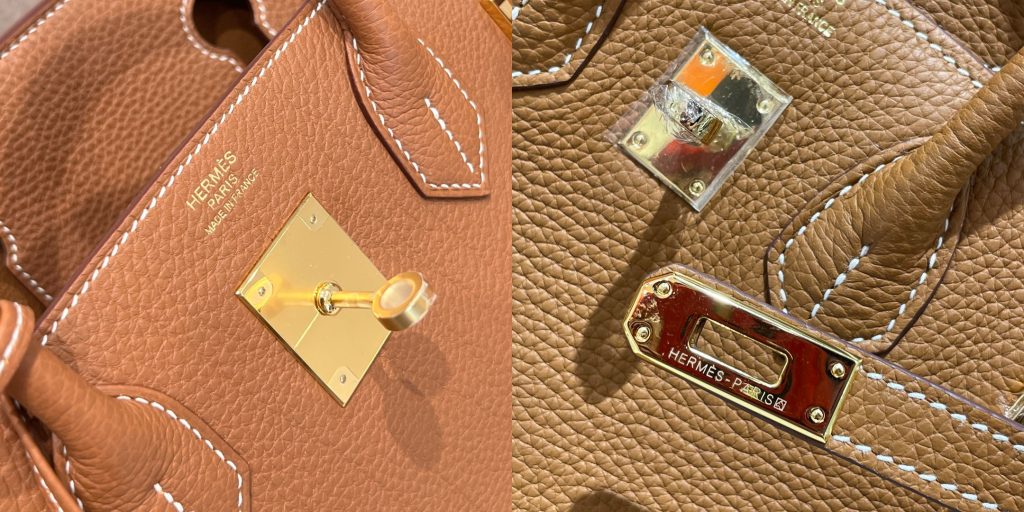 The hardware on a Hermès bag is just as important as every other feature on the bag. Authentic Hermès bags are made from either gold plated brass (called GHW for short) or from palladium (called PHW for short). For Hermès bags with gold hardware 18-karat gold plating is typically used, however it is important to note that some rarer styles may actually come with 24-karat gold plated hardware.